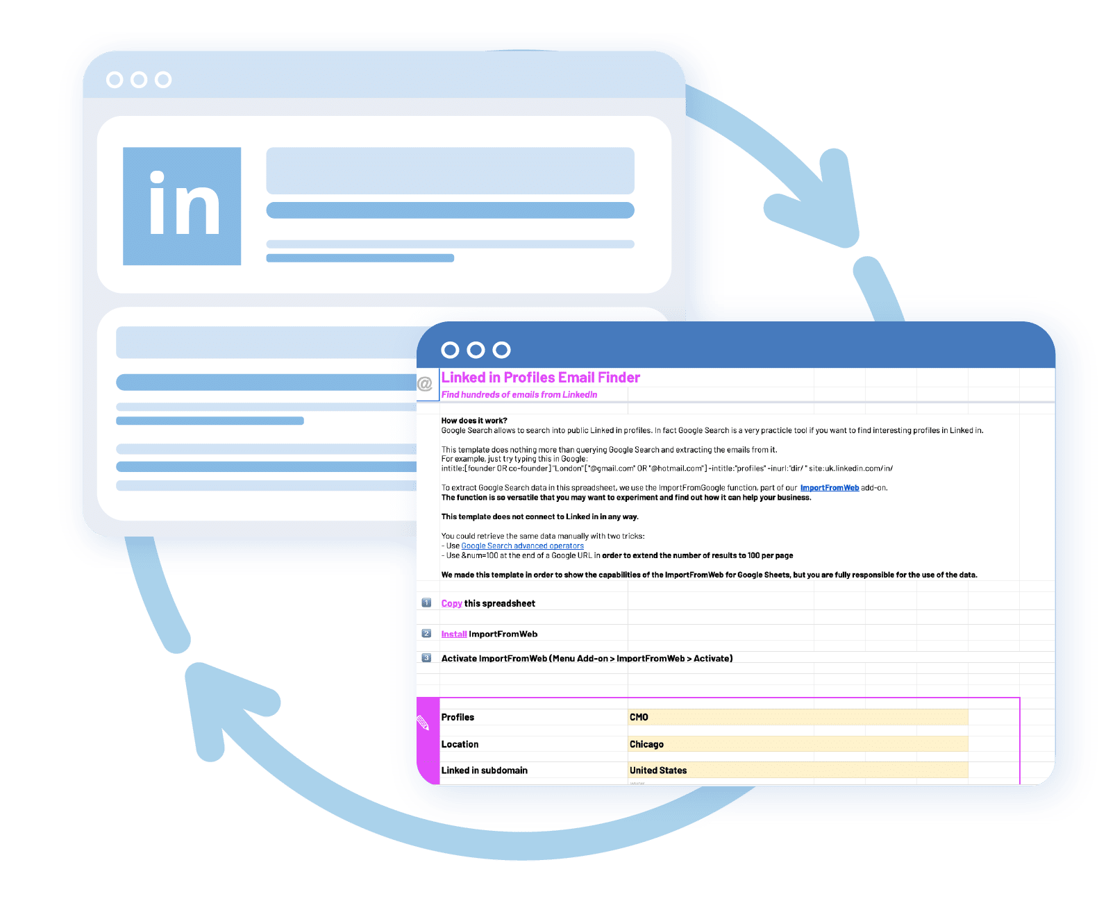 ImportFromWeb is the only web data scraper designed to collect, cross, manipulate and analyze web data directly in your Google Sheets.