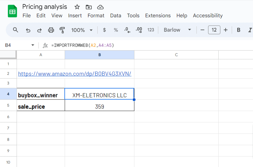 =IMPORTFROMWEB("Amazon product URL", "buybox_winner,sale_price")