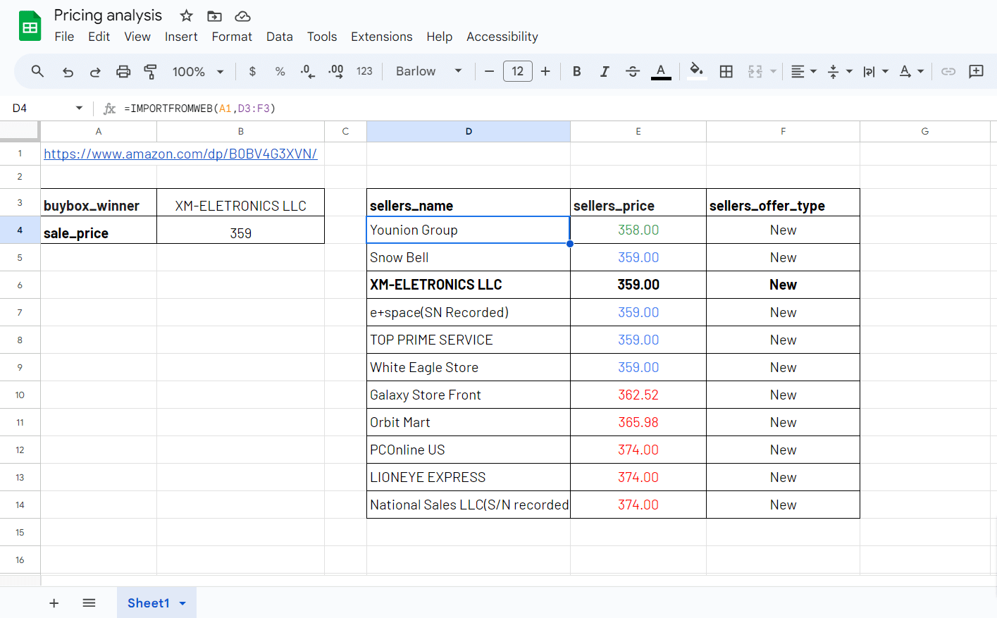 The next step consists in enriching your spreadsheet with the other sellers competing on the product. This can be done also using the =IMPORTFROMWEB() formula: