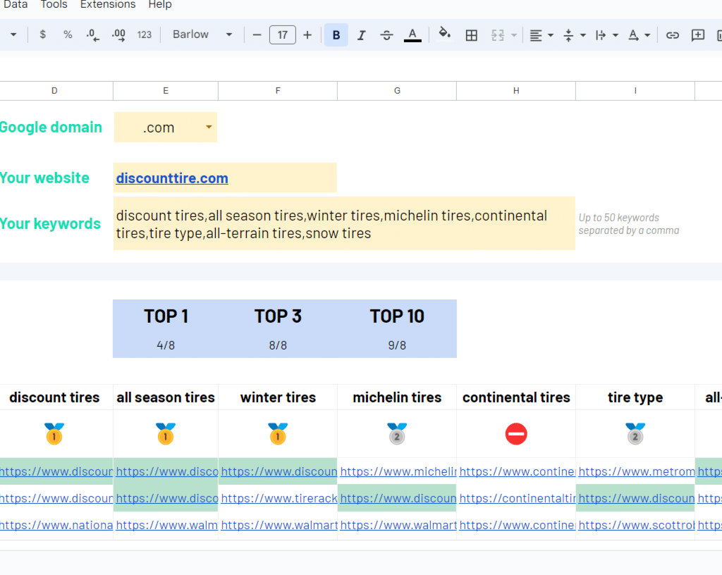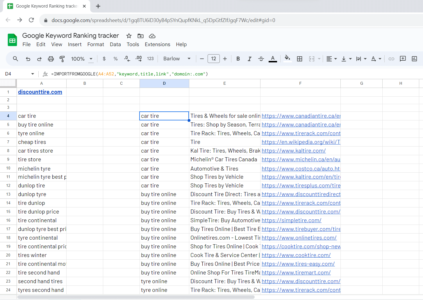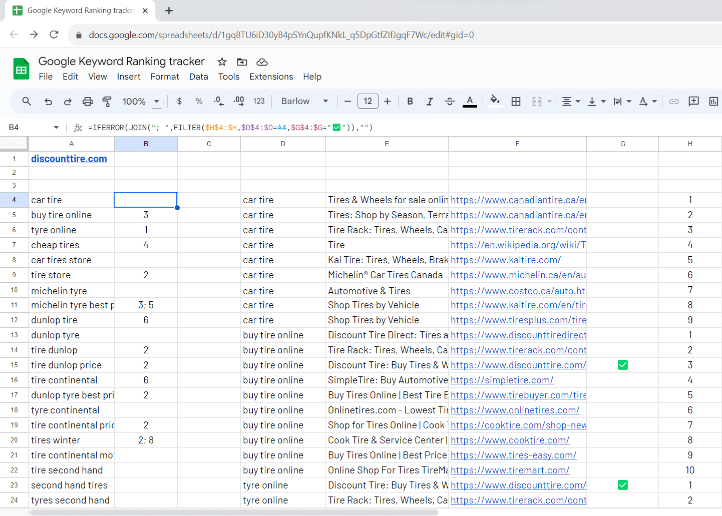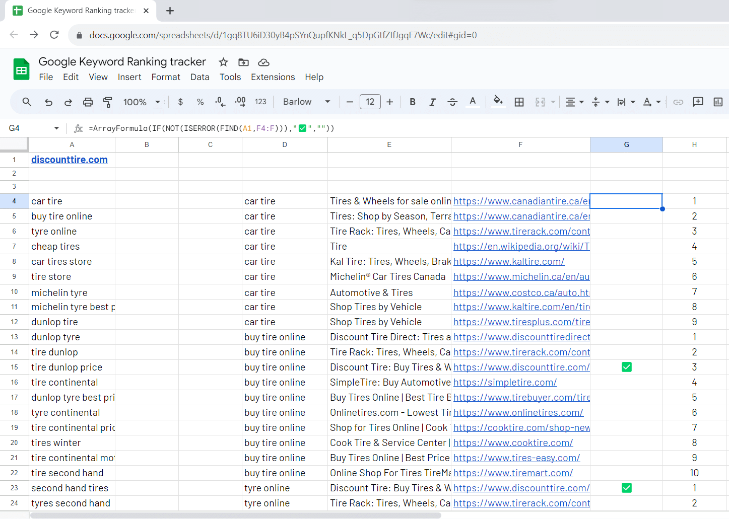 This formula adds next to each result a “✅” symbol indicating that your website (discounttire.com in our example) ranks for the keyword. The ArrayFormula ensures that the entire column F is processed at once.