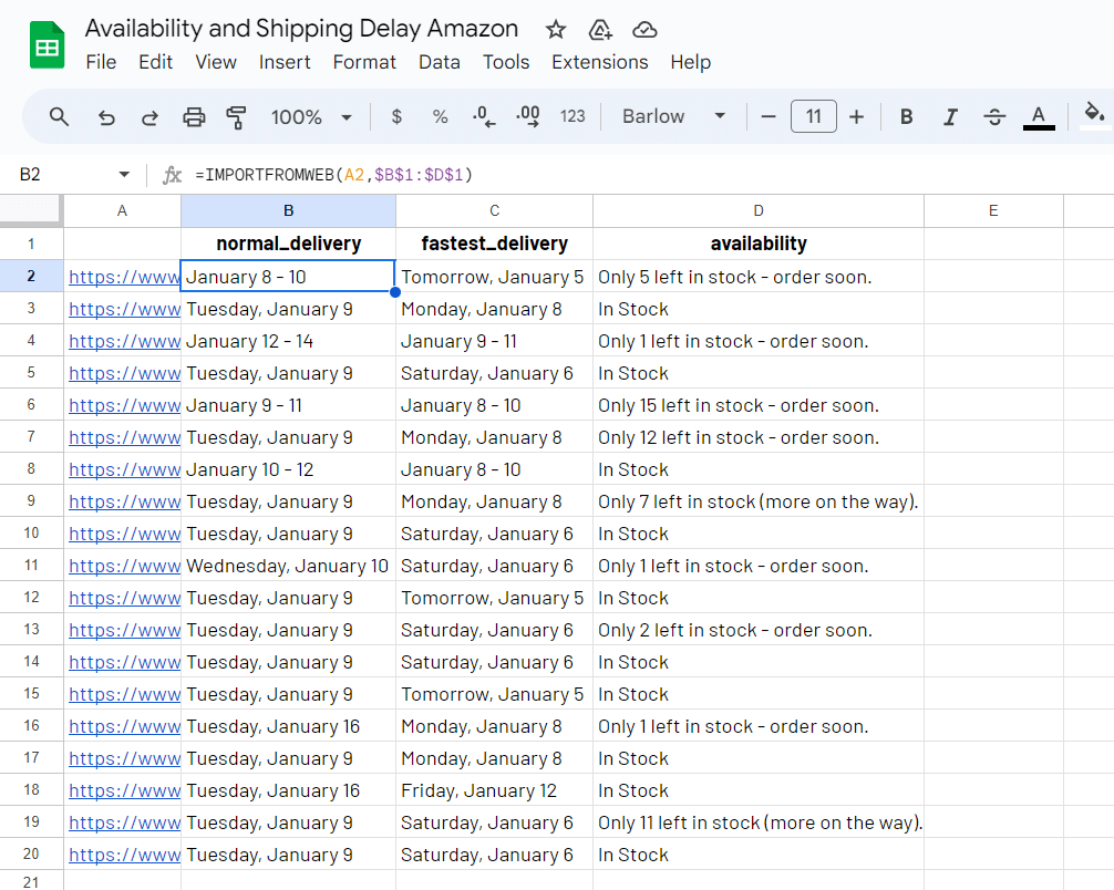 =IMPORTFROMWEB("Amazon product URL", "normal_delivery,fastest_delivery,availability")