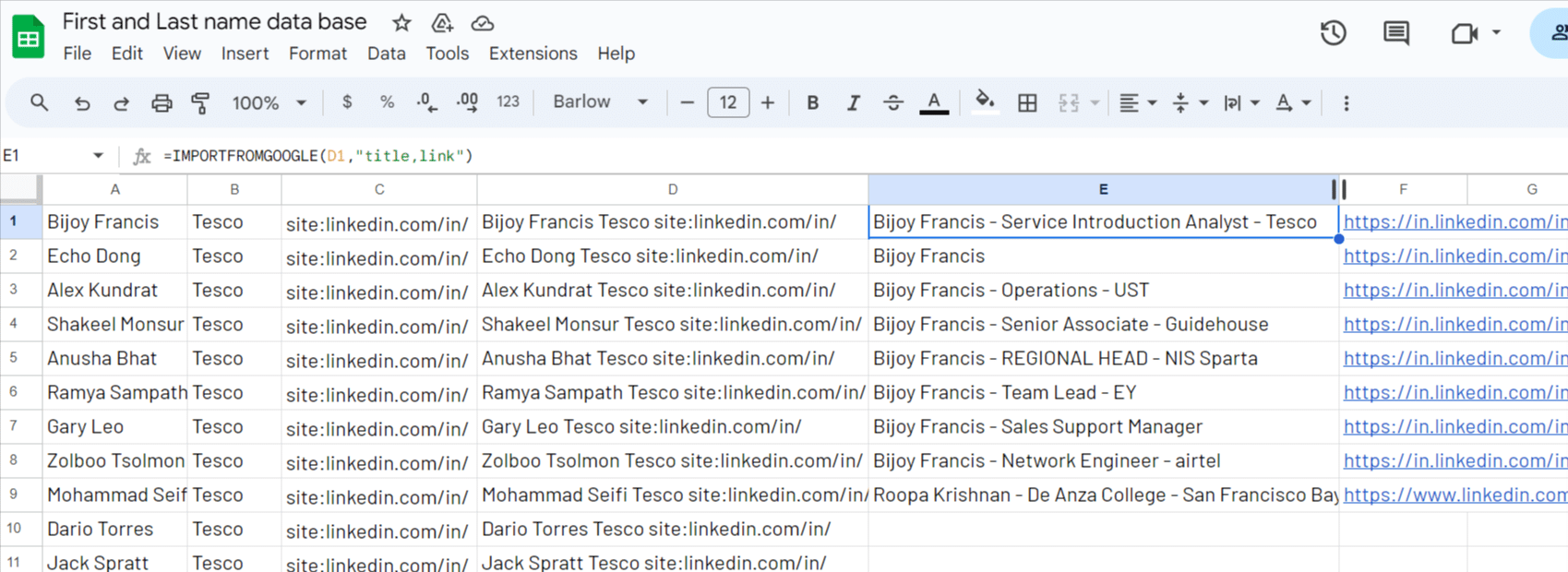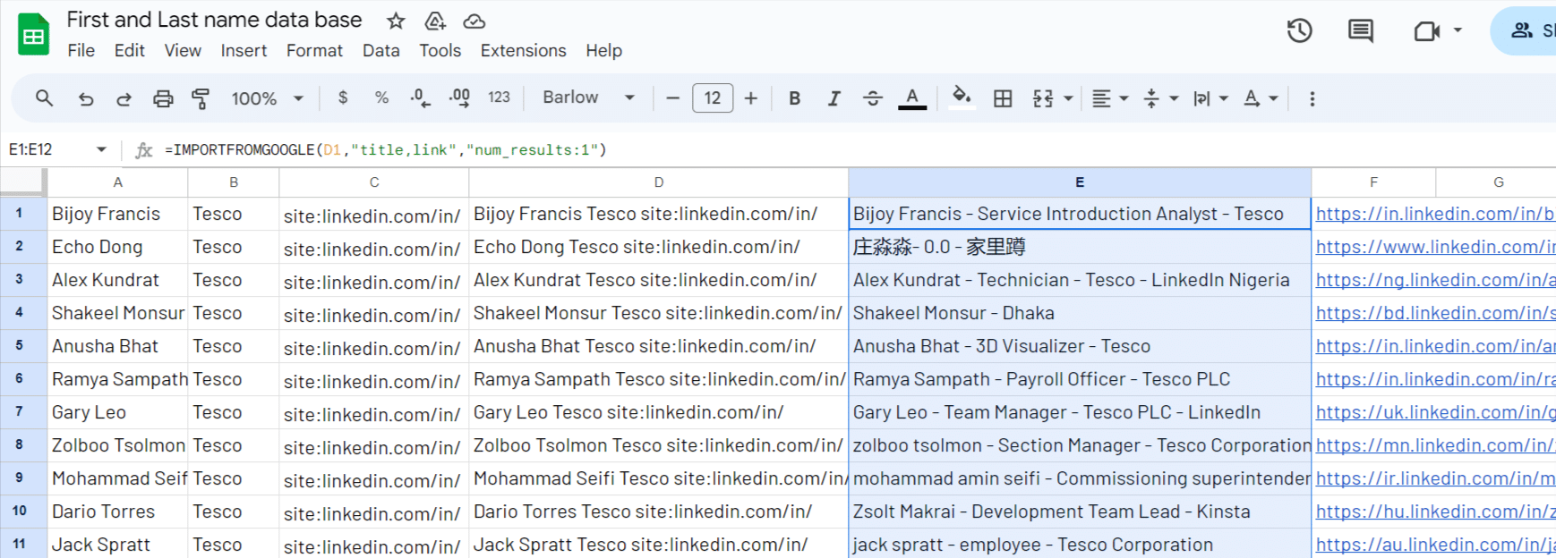 Then, open a new spreadsheet and input in the first column all the employees names. To fine tune the Google queries you will run and maximize your chances to get the right LinkedIn profiles URLs, we recommend you to add in the second column the company name, here Tesco.