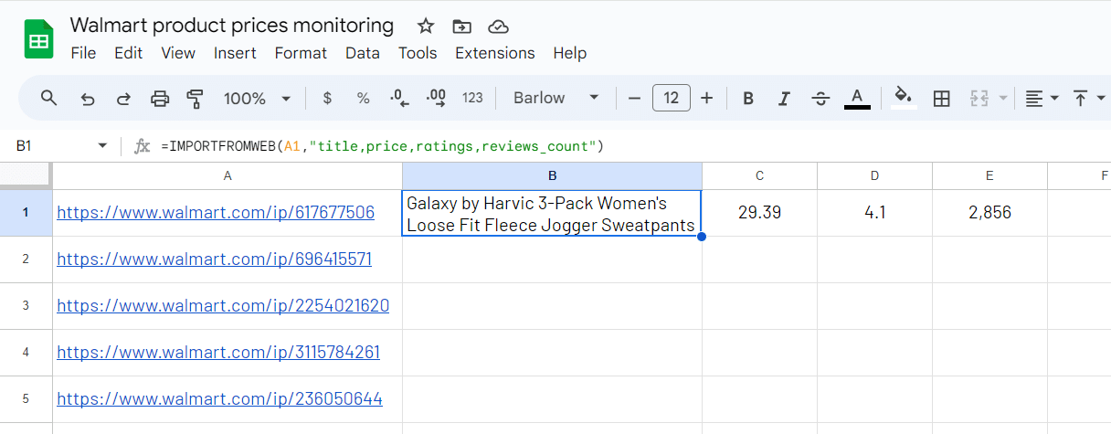 Now your Walmart price monitoring tool is ready, you can monitor the prices at your desired frequency. Whenever you open the spreadsheet and execute the =IMPORTFROMWEB() formula, you get an updated view over your results!