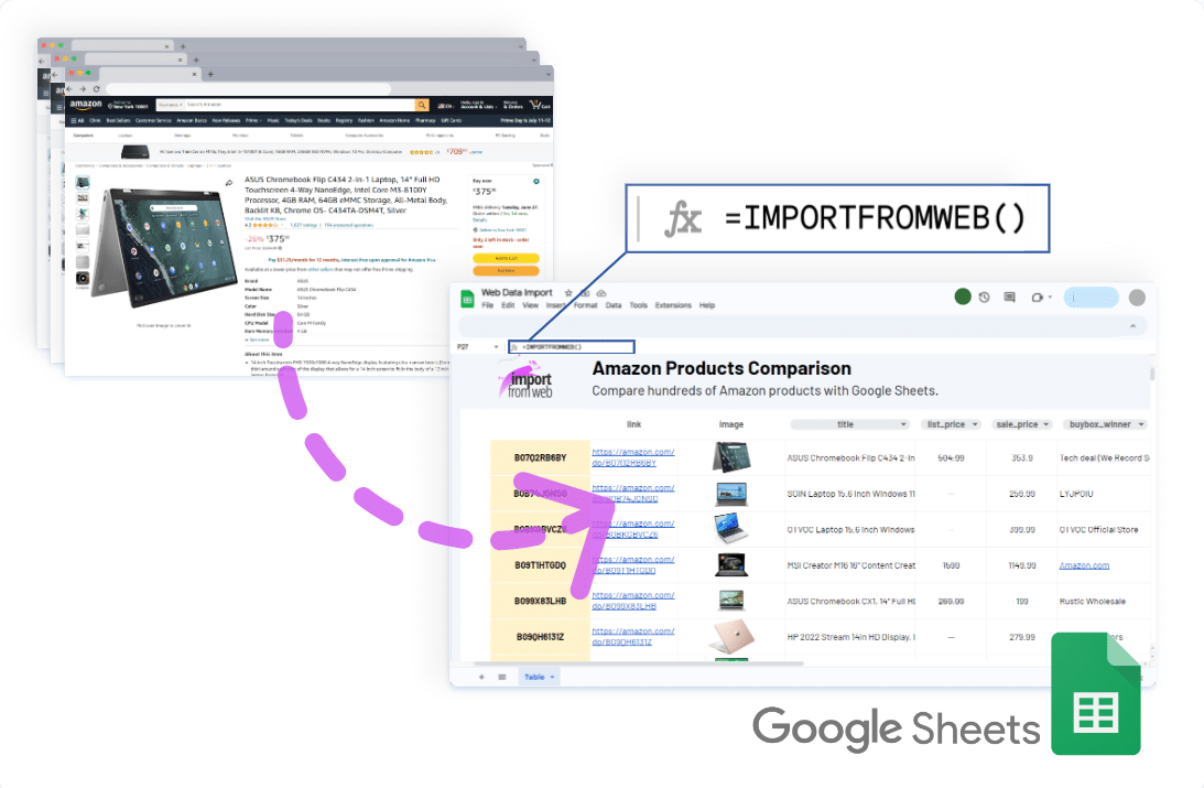 ImportFromWeb is a Google Sheets add-on that enables to easily extract real-time data from any Amazon product page. The process relies on a simple Google sheets function – named =IMPORTFROMWEB() – that requires 2 parameters: the Amazon product page URL and one or a list of selectors specifying the data points to be extracted. Executing the function outputs the data points requested in a simple table.