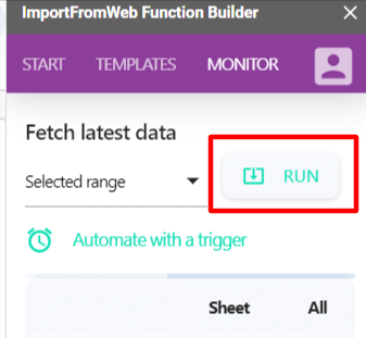 When you execute the =IMPORTFROMWEB() function (with the RUN button on the sidebar below), it fetches the latest Amazon search results, providing you with the most up-to-date products listing available at that moment.