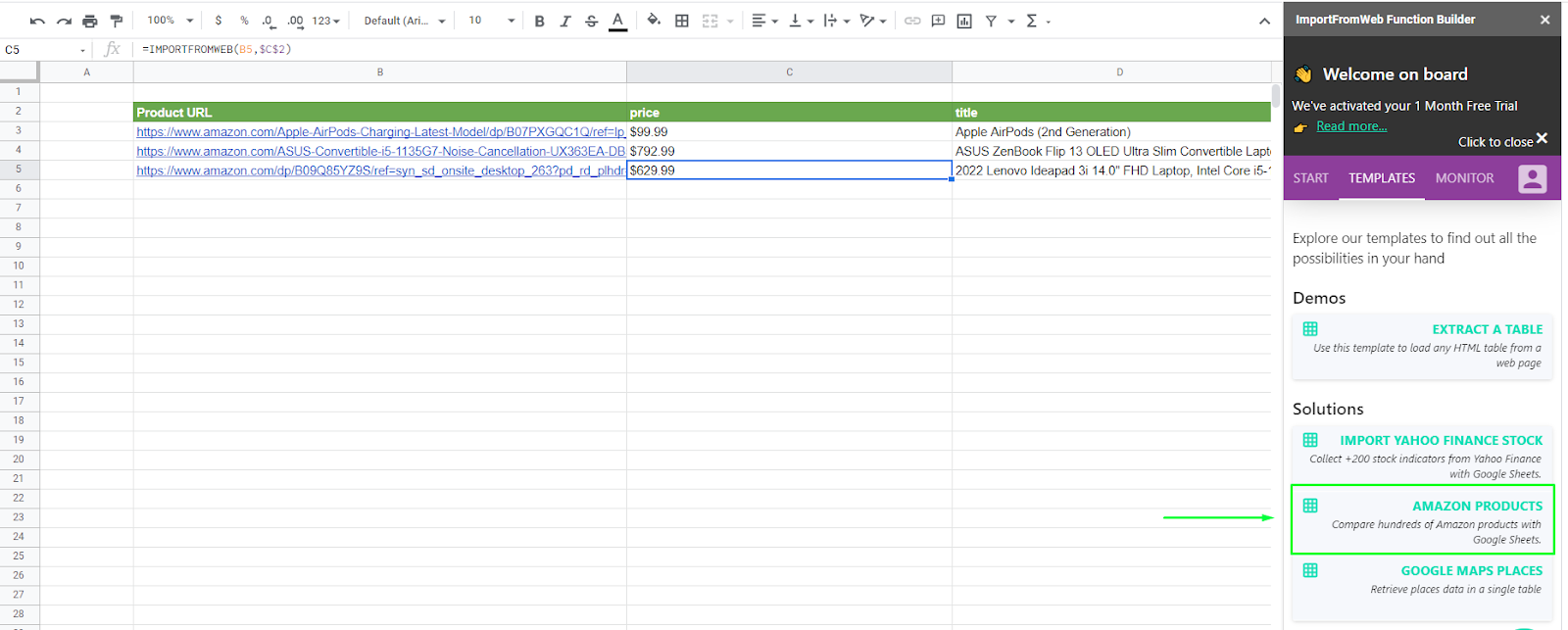 Whether you need to simply compare Amazon products prices, check availability, scrape product reviews or get your competitors inventory, ImportFromWeb is the right tool for you!