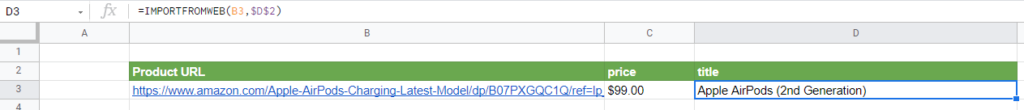 We will do the same for the “title” column by changing the $C$2 value to $D$2 so that it points to the “title” cell and voila – we have the price and the title for our first product! This is how the values look like in our example: