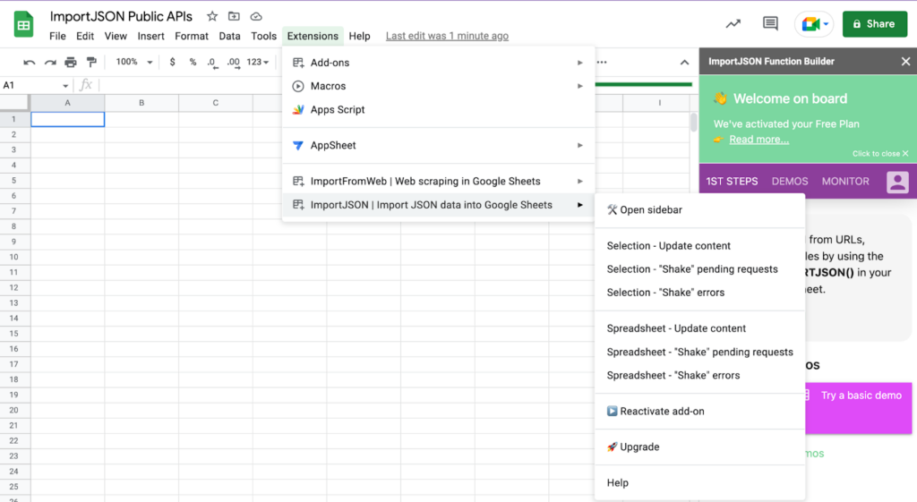 Open Google Sheets and go to Extensions → ImportJSON and activate the add-on. Click on Open Sidebar if it’s not already open.