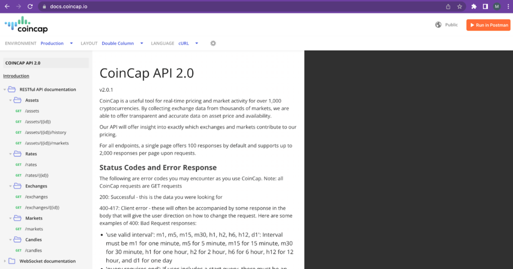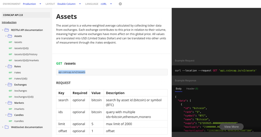Before you start, you’ll have to find a public API that you want to use. If you don’t have a specific one in mind, check out the list of Public APIs on Github. For this example, we’ll be using one of the Cryptocurrency APIs, CoinCap API. You can identify the public APIs as those that don’t need an authentication key.