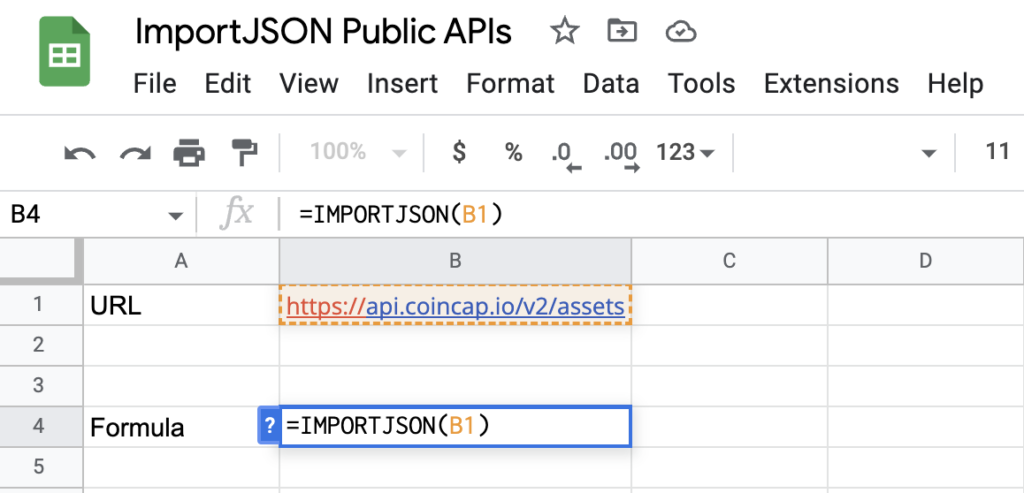 ImportJSON is a Google Sheets add-on that allows you to import data from an API and automatically transforms this data into a readable format. Once installed, you will have a powerful new formula available in Sheets.
