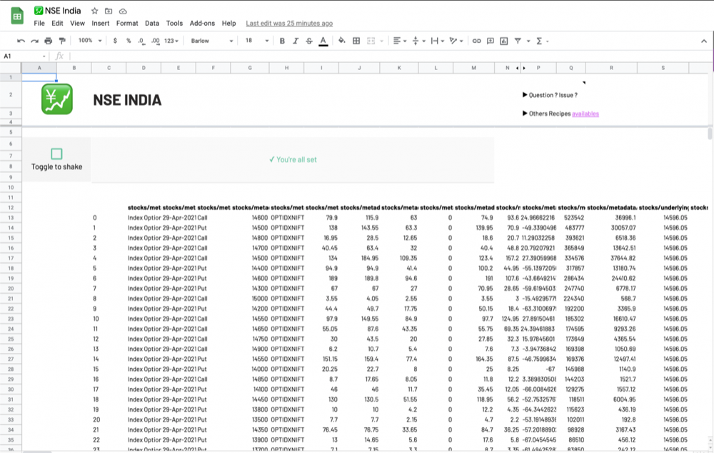 Fetch option Chain (Equity Derivatives) and quotes from NSE India in a simple Google Sheets template.