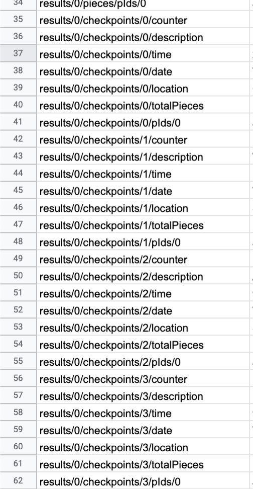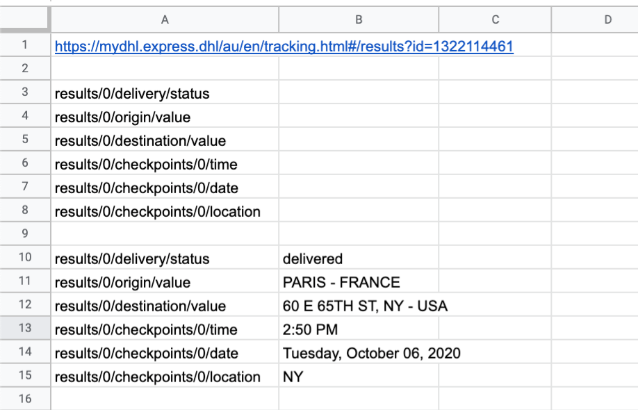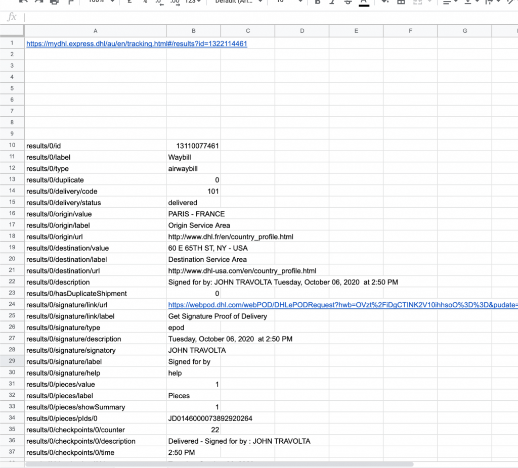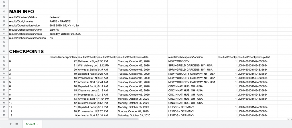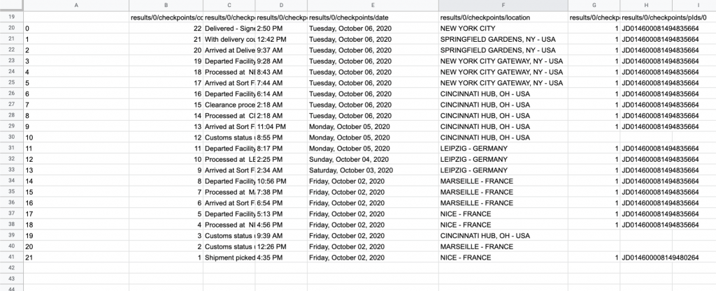 In the data provided by DHL that we can see by using IMPORTJSON with no filter, we can notice that a bunch of keys seem to indicate different checkpoints: