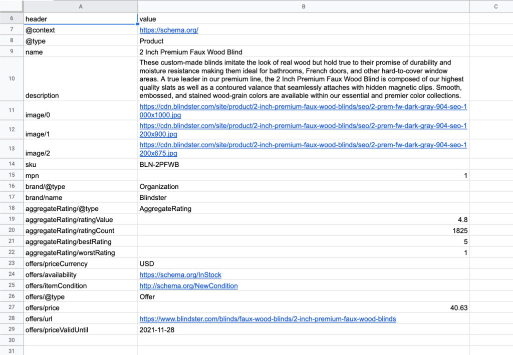 =IMPORTFROMWEB(IMPORTFROMWEB(A1,"//*[@type='application/ld+json'][contains(text(),'Product')]"), ,"isJSON, showHeaders")