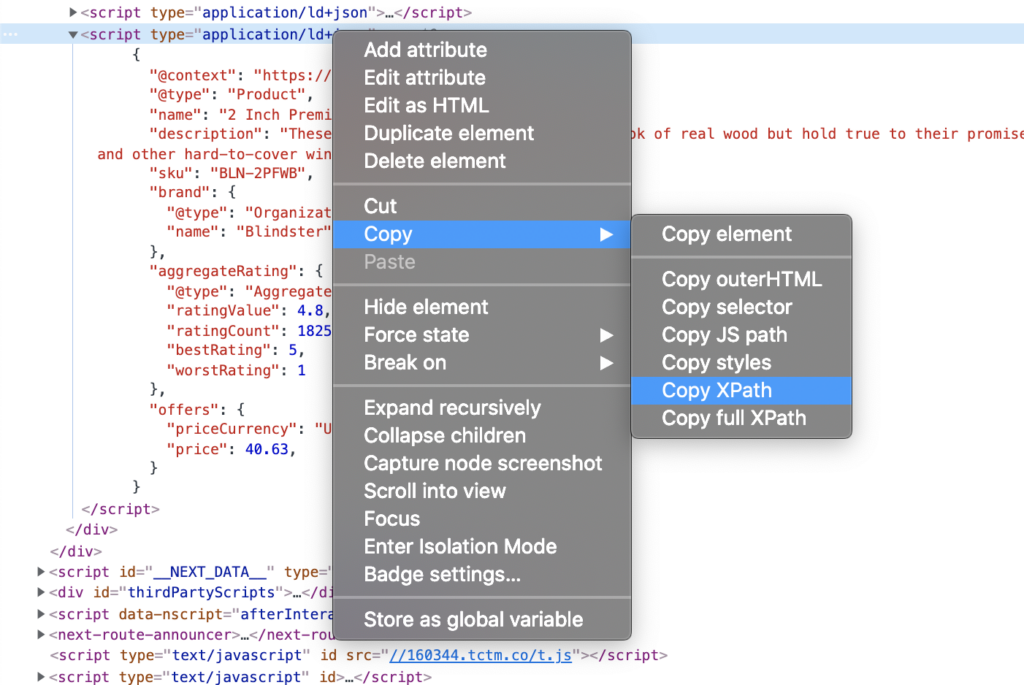 //*[@type='application/ld+json'][contains(text(),'Product')] is the xPath retrieved in the previous step