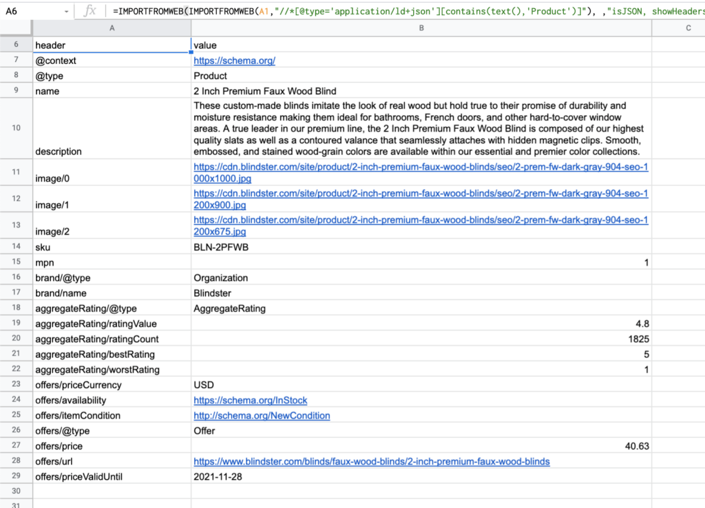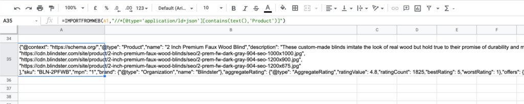 =IMPORTFROMWEB(A1,"//*[@type='application/ld+json'][contains(text(),'Product')]")