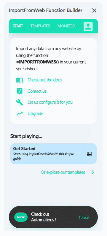 Once you activate ImportFromWeb in a Google Sheets file, you notice that a sidebar opens on the right part of your spreadsheet.