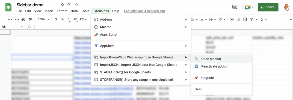 Please note that the sidebar should open automatically if your spreadsheet already contains some ImportFromWeb functions.