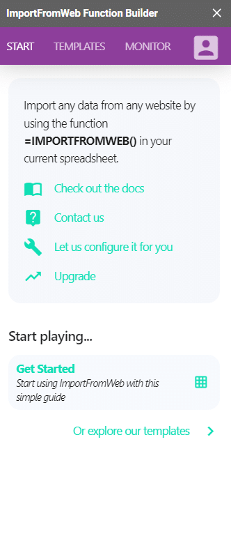 ImportFromWeb comes with a sidebar for Google Sheets that opens when you activate the add-on on your spreadsheet. It has been designed to help you onboard and get to know with all the ImportFromWeb potential.