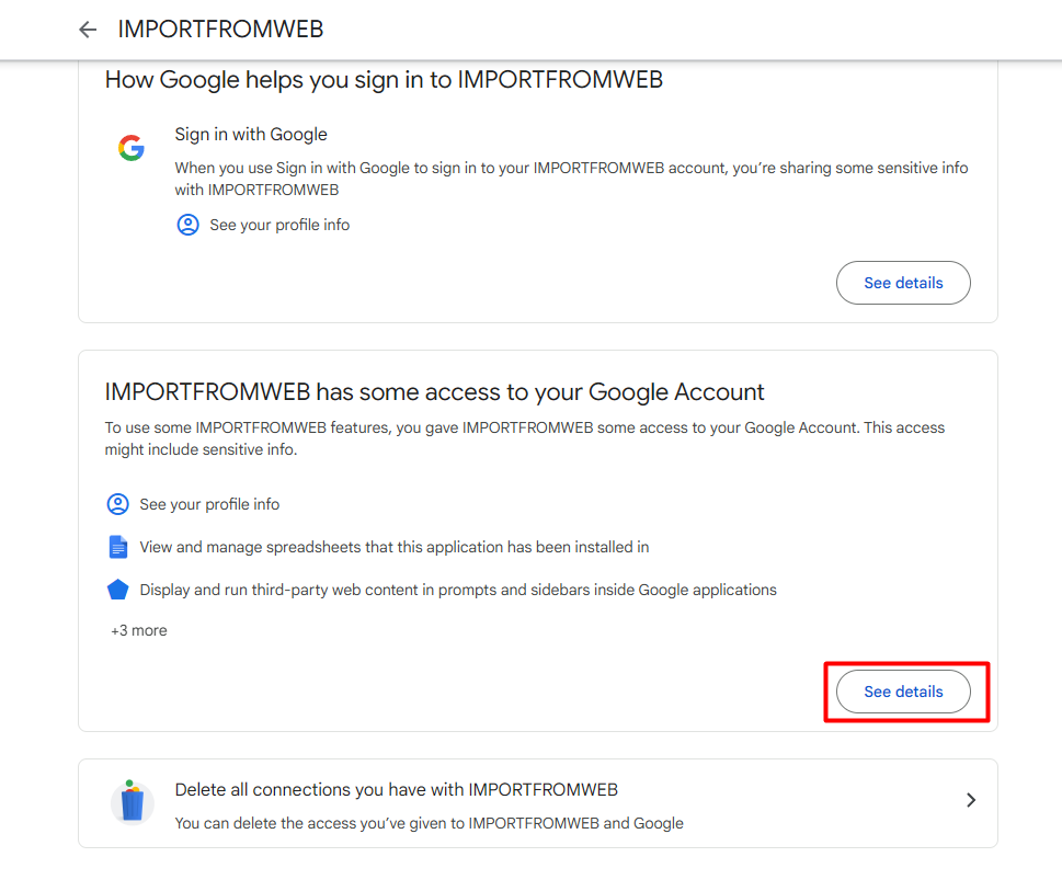 Go to https://myaccount.google.com/permissions, click on the IMPORTFROMWEB and click on See details as shown below: