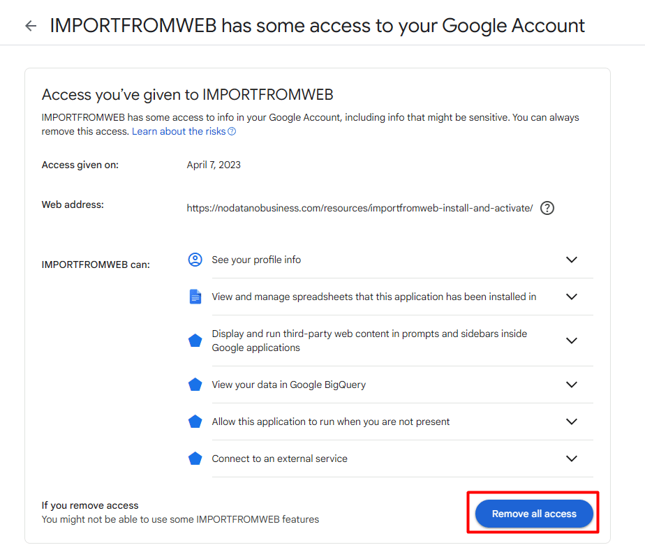 Go to https://myaccount.google.com/permissions, click on the IMPORTFROMWEB and click on See details as shown below: