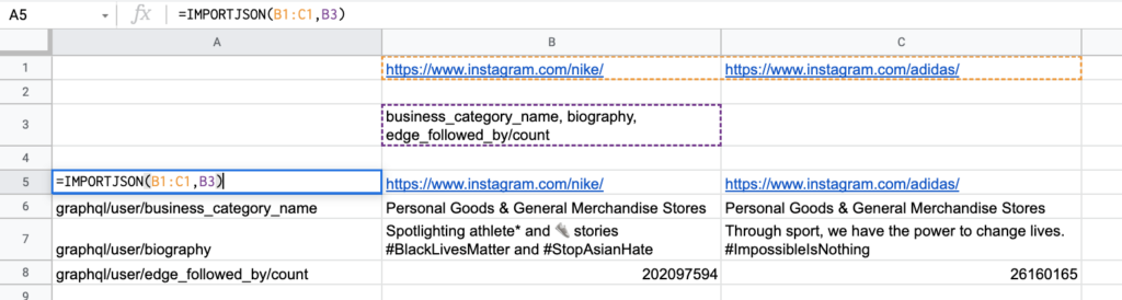 IMPORTJSON will output data from each profile side-by-side (column B and column C)