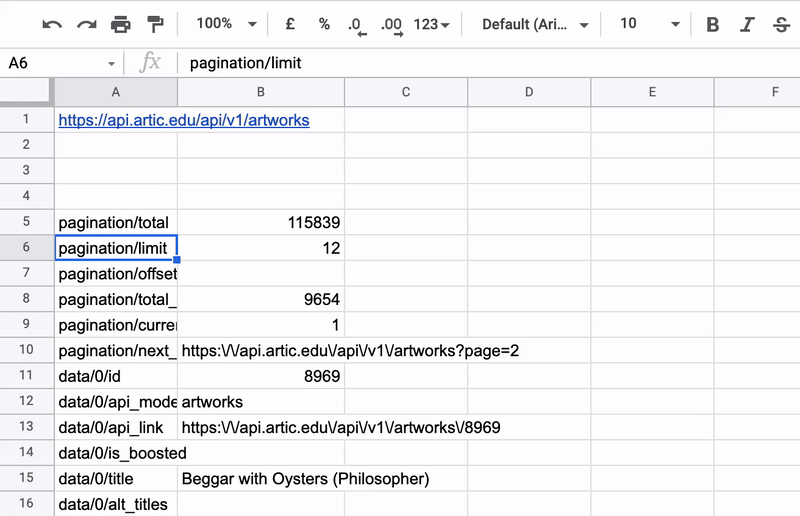 With the ImportJSON add-on enabled in GoogleSheets, we copy/paste the url to the first API of published artworks in their collection. By inserting this into the JSON function, we now have access to all of the published works currently in the Art Institute of Chicago. And it took us less than 3 minutes to retrieve.