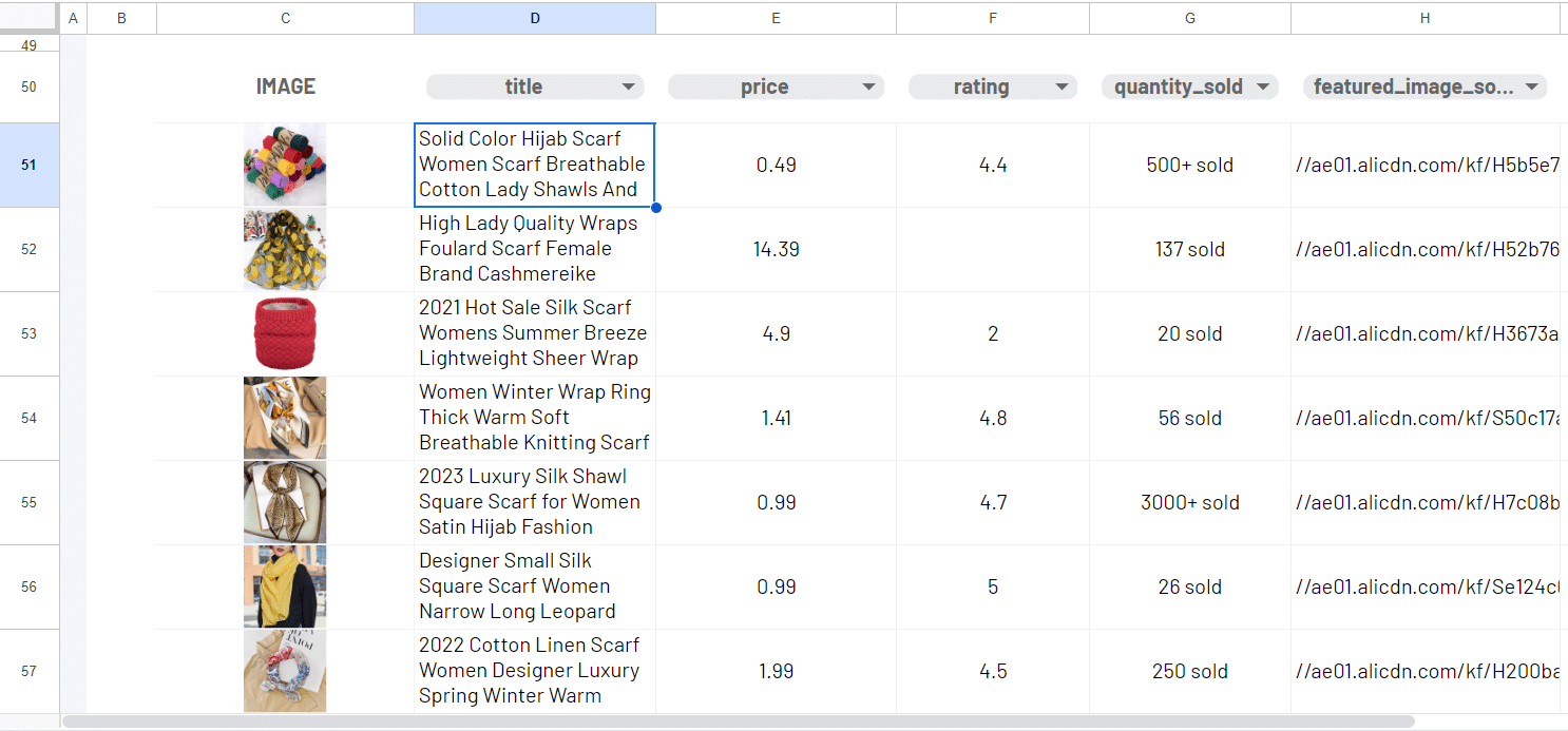 With =IMPORTFROMWEB(), you extract the following AliExpress Search results data.