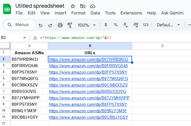 You can enter the product URLs directly, or generate them from ASINs using this formula: ="https://www.amazon.com/dp/"&A2 (assuming column A holds your ASINs).