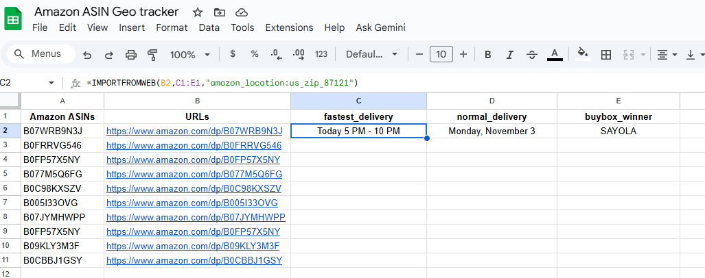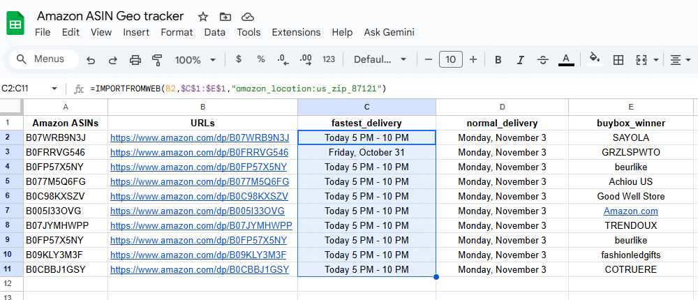 Once you’ve added the $ symbols around your data selectors, drag the formula down to the last row: =IMPORTFROMWEB(B2,$C$1:$E$1,"amazon_location:us_zip_87121")
