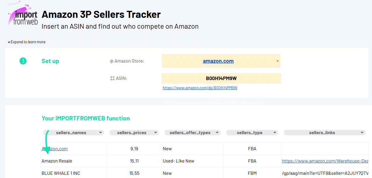 To help you get started right away, you can use this free Google Sheets template to extract all the offers for 1 specific listing or this template to track 3P sellers activity on multiple listings.