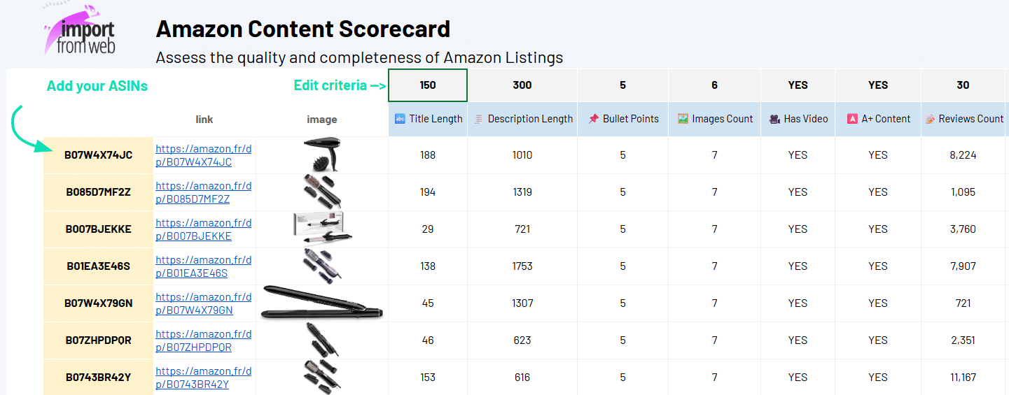 We’ve designed an easy-to-use template to extract and score the content of Amazon listings.