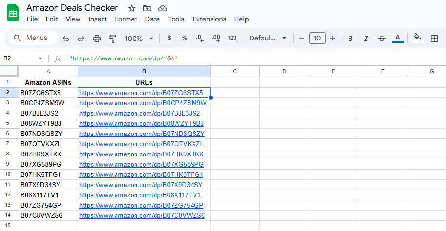 You can input the product URLs directly or build them using the product ASINs: ="https://www.amazon.com/dp/"&A2 (where column A contains all your ASINs).