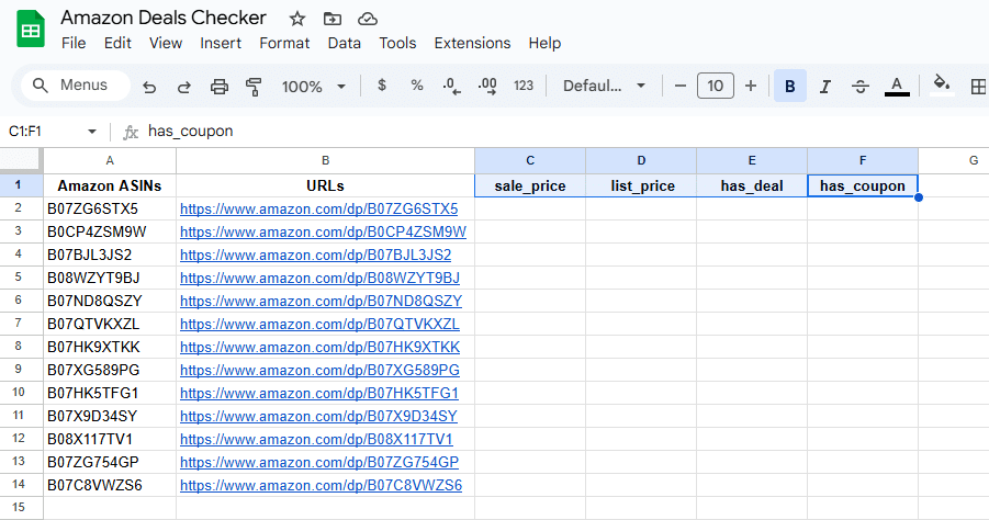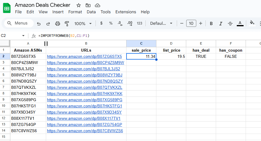 We’ve designed an easy-to-use template, so you can try our Amazon Deals checker. Make sure you have installed and activated ImportFromWeb in your Google Sheets.