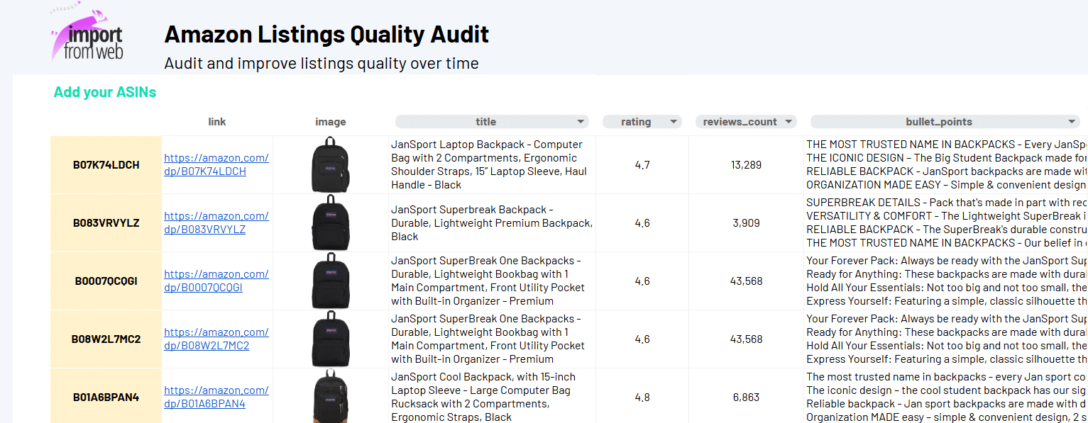 Copy our Amazon Content Extractor template, add your ASIN list, and instantly access: