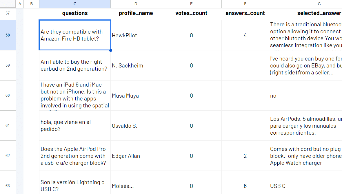With =IMPORTFROMWEB(), you extract the following data points from Amazon Q&A pages: