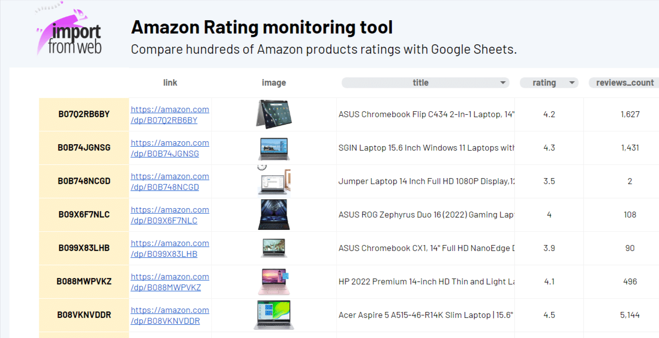 Using the ImportFromWeb add-on and the function it adds to Google Sheets, you can extract Amazon product ratings in bulk without technical knowledge!