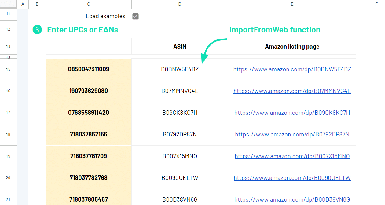 With =IMPORTFROMWEB(), you extract the product ASINs corresponding to the product EANs/UPCs.