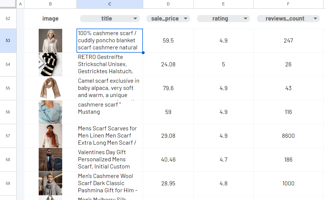 With =IMPORTFROMWEB(), you extract the following Etsy Search results data.