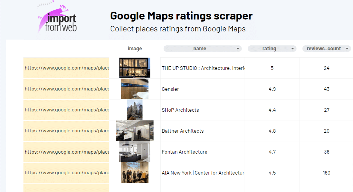 Using the ImportFromWeb add-on and the function it adds to Google Sheets, you can extract Google Maps Places ratings in bulk without technical knowledge!