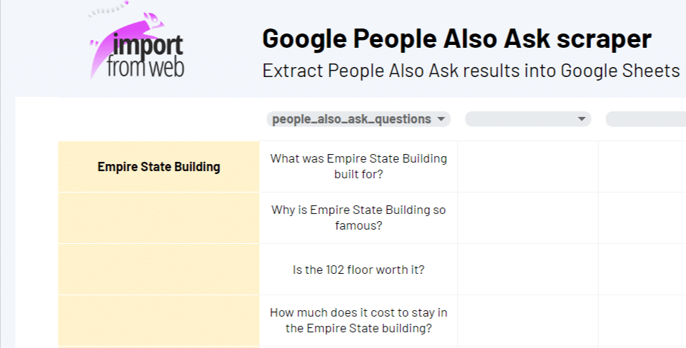 Using the ImportFromWeb add-on and the function it adds to Google Sheets, you can extract People Also Ask questions from Google in bulk without technical knowledge!