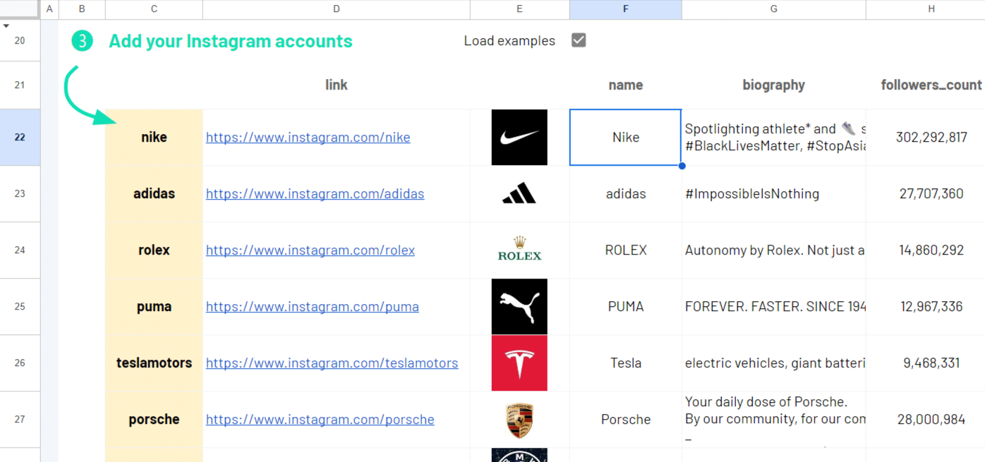 Pick the selectors you are interested in from our Instagram selectors glossary and add them to your spreadsheet. For example, you may be interested in the name, followers_count, and following-count.