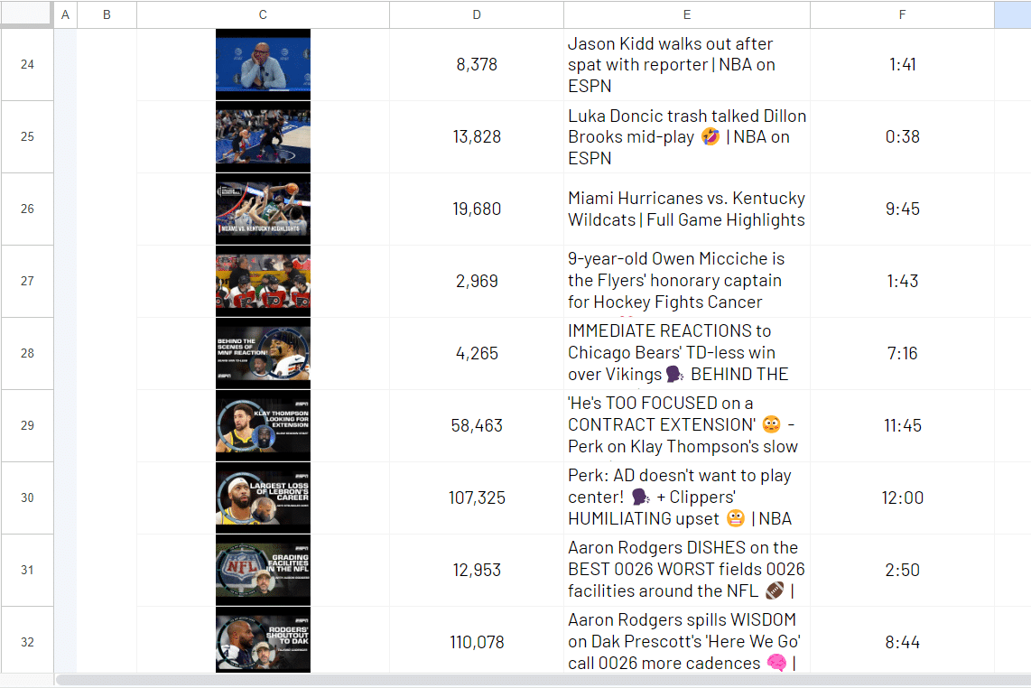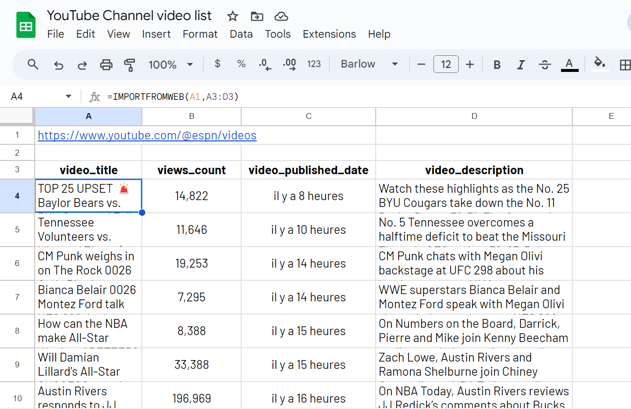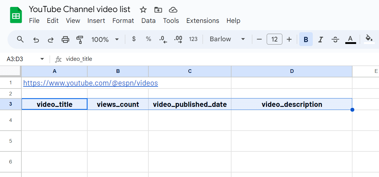 Pick the selectors you are interested in from our YouTube Channel selectors glossary and add them to your spreadsheet. For example, you may be interested in the video_title, views_count, videos_published_date and video_description.
